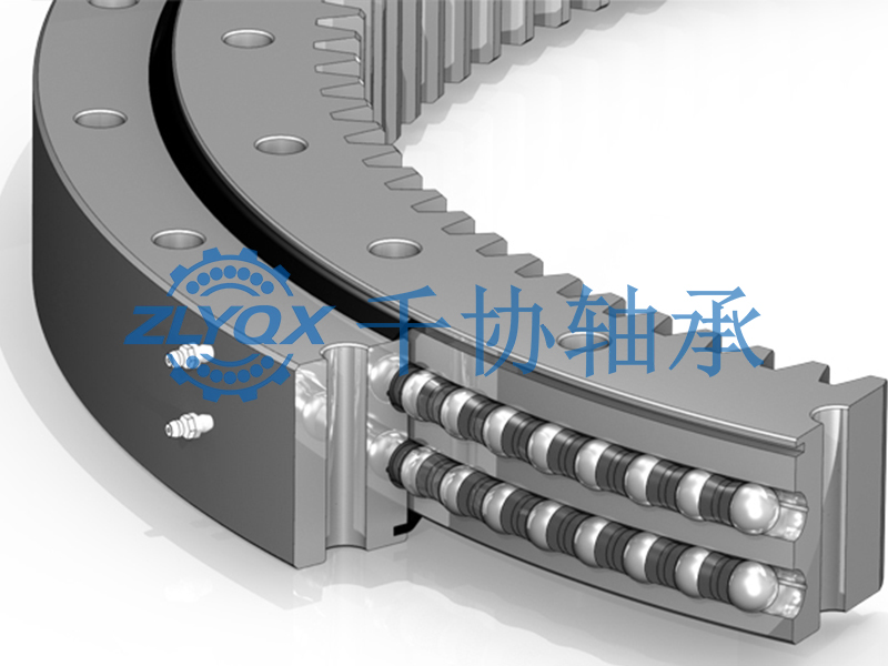 雙排球式回轉支承具有三個座圈,鋼球和隔離塊可直接排入上下滾道,根據受力狀況,安排了上下兩排直徑不同的鋼球。這種開式裝配非常方便,上下圓弧滾道的承載角都為75,能承受很大的軸向力和傾翻力矩。當徑向力大于0.1倍的軸向力時滾道須特殊設計。雙排球式回轉支承的軸向、徑向尺寸都比較大,結構緊固。特別適用于要求中等以上直徑的塔式起重機,汽車起重機等裝卸機械上。...